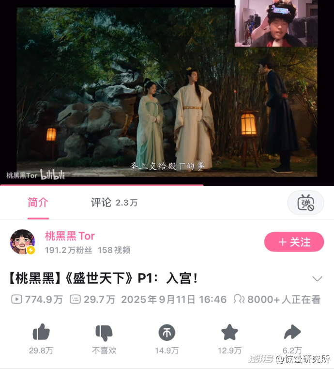 在发行策略上,影游同样借鉴了影视行业的成熟经验,尤其注重通过直播和短视频实现快速破圈。据惊蛰研究所观察,在B站平台上,逍遥散人、某幻君、桃黑黑等头部游戏UP主对《盛世天下》进行的视频切片和直播内容表现极为突出,部分单集视频播放量达到百万甚至千万级别。即便在游戏上线2周后,桃黑黑的《盛世天下》直播回放仍能吸引超过8000人同时在线观看,足见其内容的长尾吸引力。